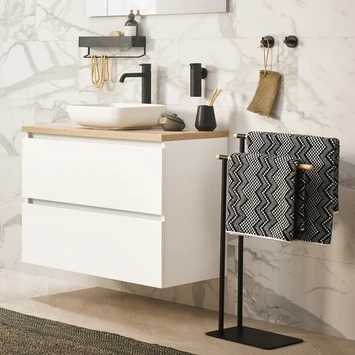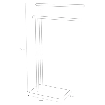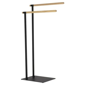 Het Sealskin Handdoekrek Brix Metaal Zwart is een handig dubbel handdoekrek voor in je badkamer. Aan de 2 standaarden hang je gemakkelijk 2 handdoeken op. Met de afmeting van 79,5 cm hoog, 43 cm breed en 24 cm diep past dit vrijstaande handdoekrek in vrijwel iedere badkamer en je hebt geen boorgaten nodig om het te installeren. Bovendien kun je het altijd neerzetten waar jij het wil. Dat biedt je een hoop flexibiliteit. De prachtige houten accenten in combinatie met de zwart metalen basis geven een robuuste uitstraling en passen in een landelijk of industrieel interieur. Op het rek krijg je 1 jaar garantie. Het is wel belangrijk dat je de set regelmatig schoonmaakt met een vochtige doek: zo heb je lang plezier van jouw handdoekhouder. In de Brix-serie kun je ook andere bijpassende producten kopen bij GAMMA.