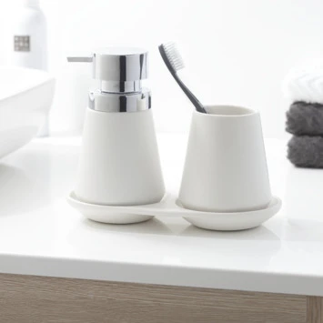 De Conical serie kenmerkt zich door de moderne conische vorm, een echte eyecatcher voor de badkamer of toilet. Gebruik de tray om de zeeppomp en de beker op te plaatsen voor een mooi opgeruimd geheel. Uitgevoerd in wit met chroom voelt deze set zich thuis in iedere badkamer.